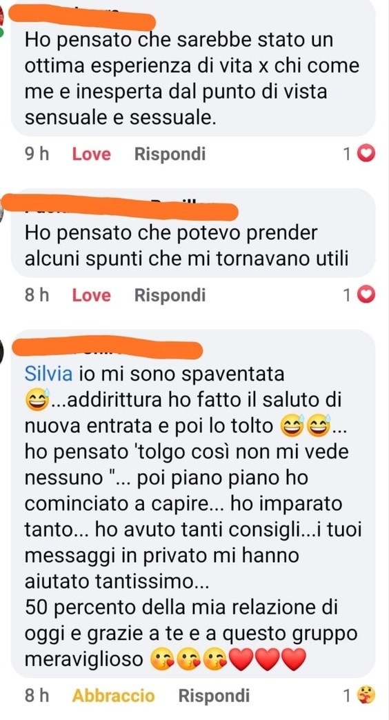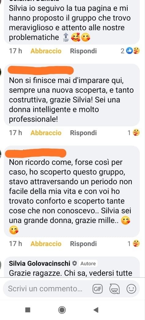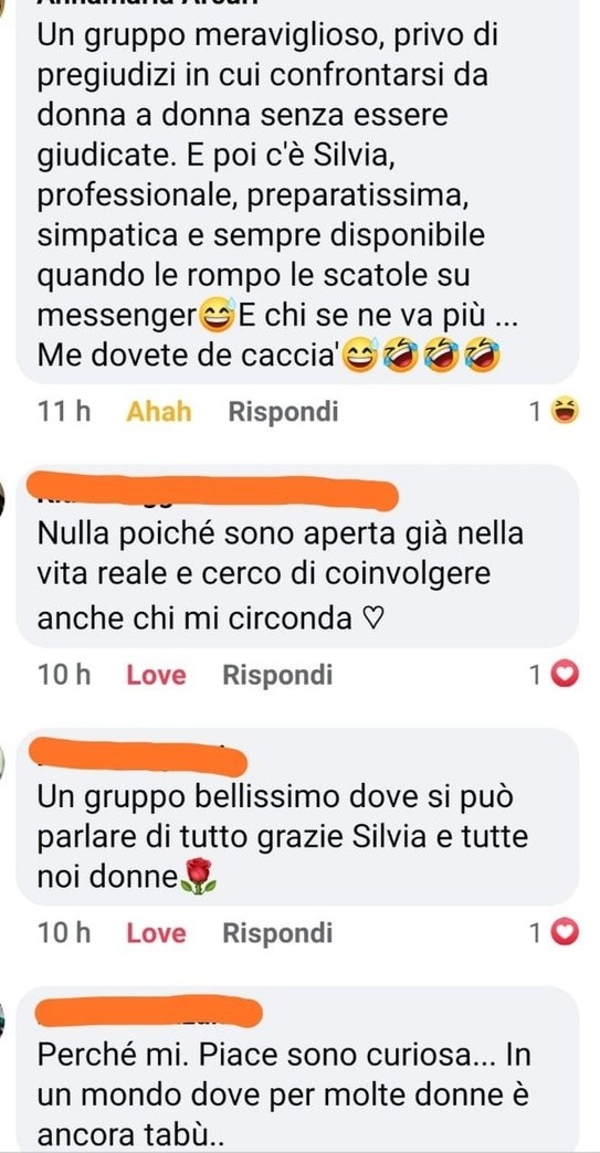 Grazie al bagaglio di esperienze che possiedo e gli studi svolti in Programmazione Neuro Linguistica sostengo efficacemente questa meravigliosa comunità di donne.